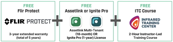 Промоцията включва безплатна 3-годишна гаранция FLIR Protect, което общо означава 5 години покритие, възможността за избор между Assetlink Multi-Tenant за 18 месеца или Ignite Pro софтуер за 1 година и безплатен 2-часов ITC курс с инструктор. Офертата е валидна до 30 юни 2026 г., а продукта трябва да се регистрира в рамките на 60 дни след покупка. Промоцията не важи за камерите от серията T1k.