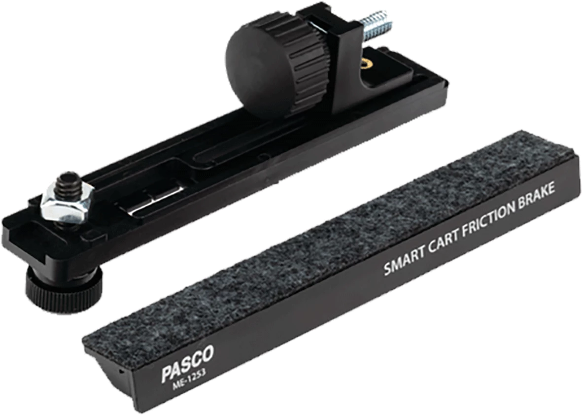 Умната количка ME-1253 със спирачка на трение е проектирана да спира движеща се умна количка във всичка позиция, избрана от потребителя, на динамична пътека. Използва трение между филцова лента на количката и закръглена винтова гайка на скобата за пътеката, за да намали скоростта на количката. Двукомпонентният дизайн се състои от триещ се тампон (монтира се на аксесоарната тава на умната количка) и скоба за пътека (закрепете за всички динамични пътеки PASCO). Силата на спиране се регулира лесно чрез завъртане на копчето на скобата за пътеката. Идеален е за извити конфигурации на PAStrack, експерименти с наклонена равнина или всяка лаборатория, изискваща определена спирка.